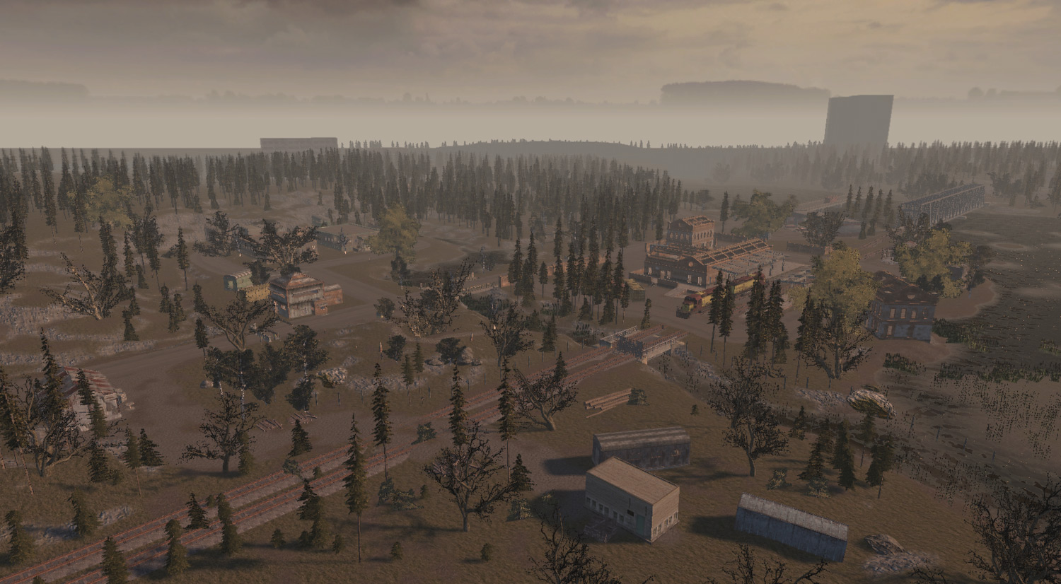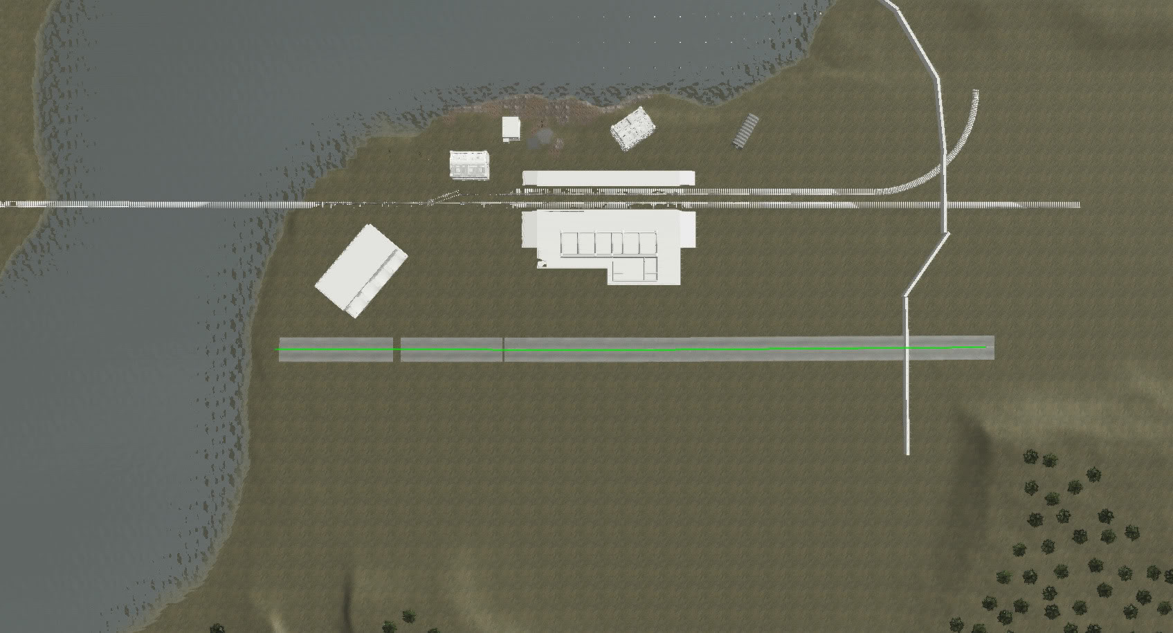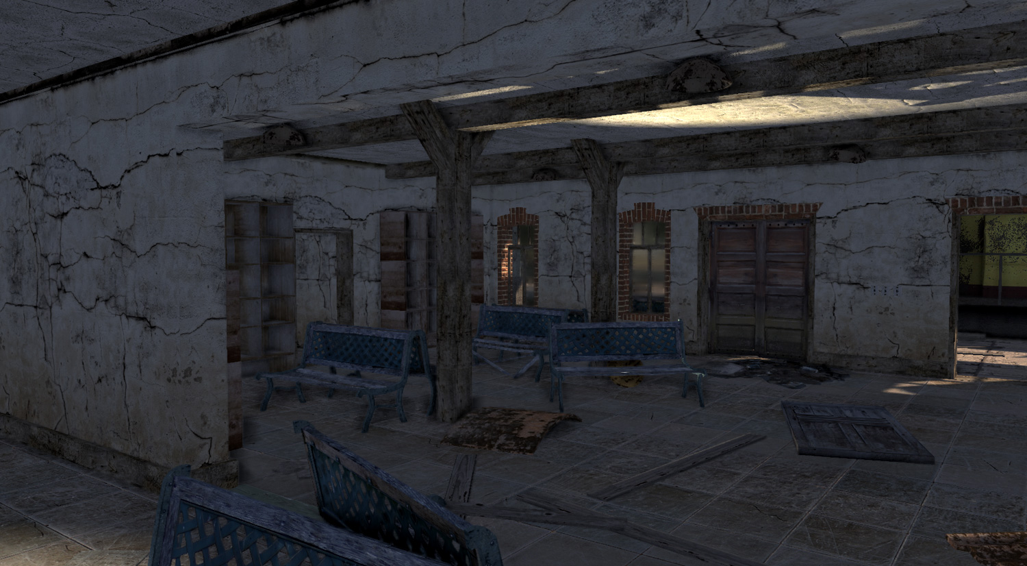 By this point the project was moving at full speed, and many elements were being worked on at the same time. Many modifications were make to vegetation and terrain textures, lighting, skyboxes, water and other areas. At this point in the project, I was working on nearly all areas of the map as well as working on individual assets. One of the larger buildings for this project, the railroad station, was completed along with several unique props like benches that went with the main model.