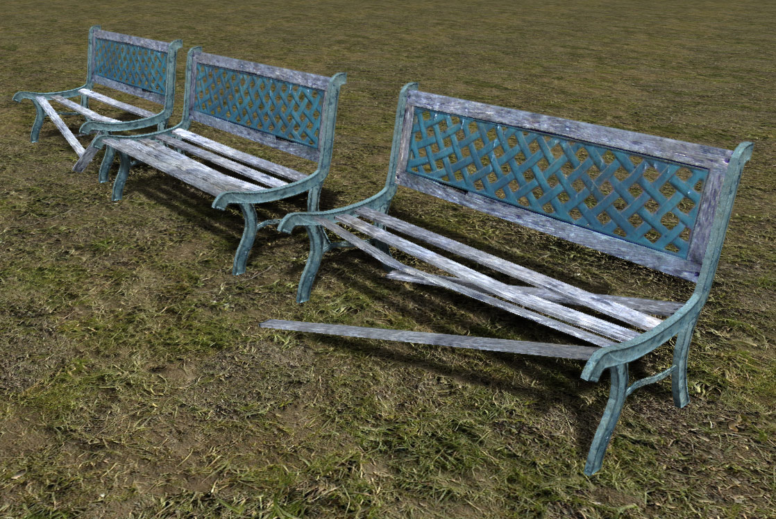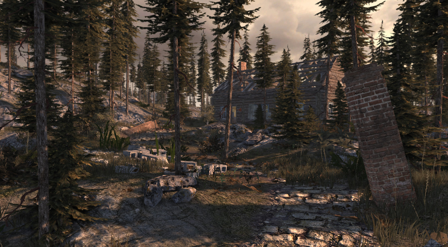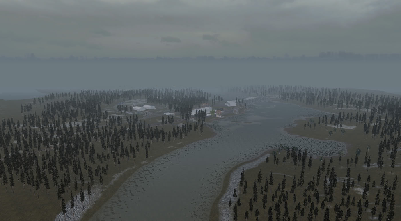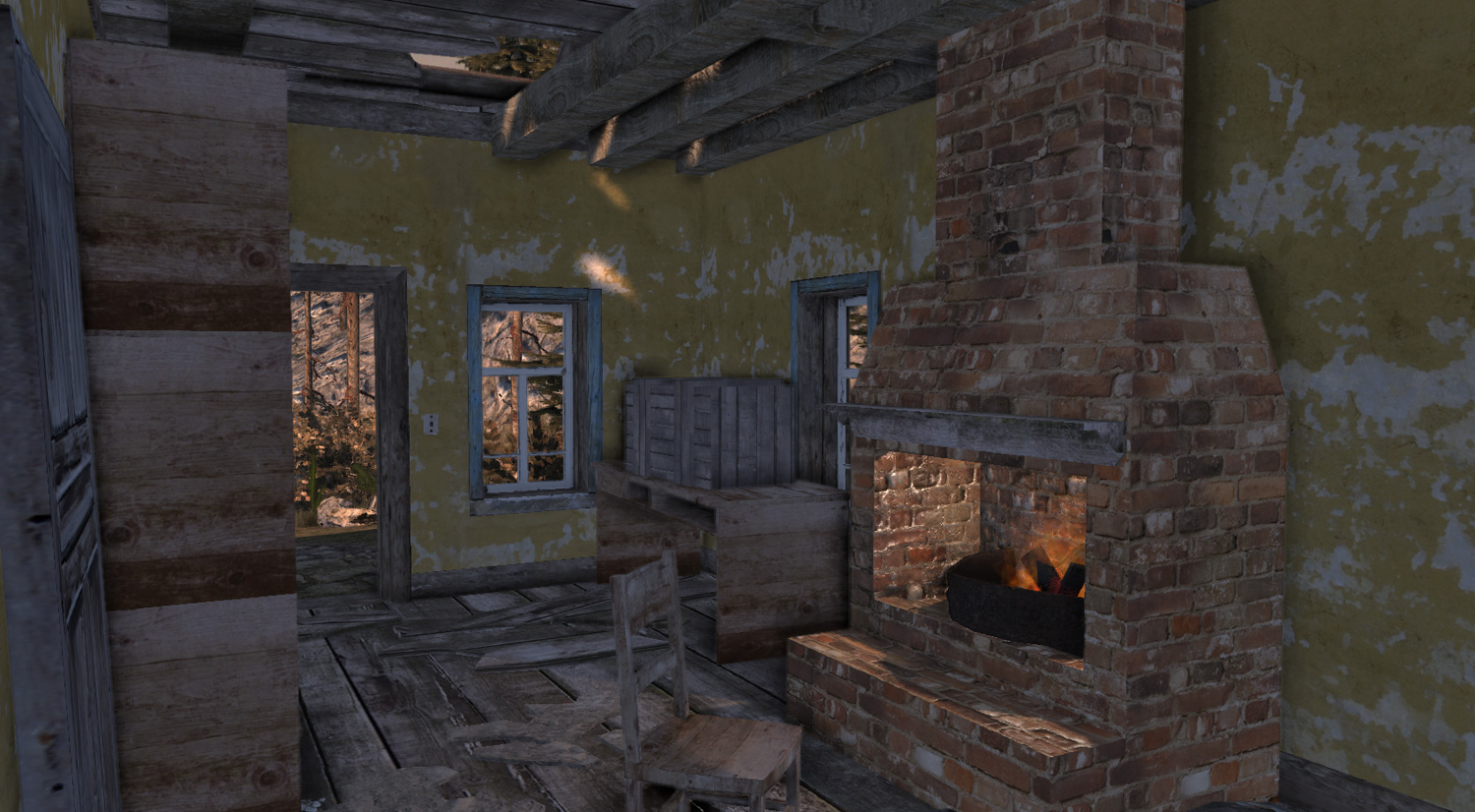 By this point the project was moving at full speed, and many elements were being worked on at the same time. Many modifications were make to vegetation and terrain textures, lighting, skyboxes, water and other areas. At this point in the project, I was working on nearly all areas of the map as well as working on individual assets. One of the larger buildings for this project, the railroad station, was completed along with several unique props like benches that went with the main model.