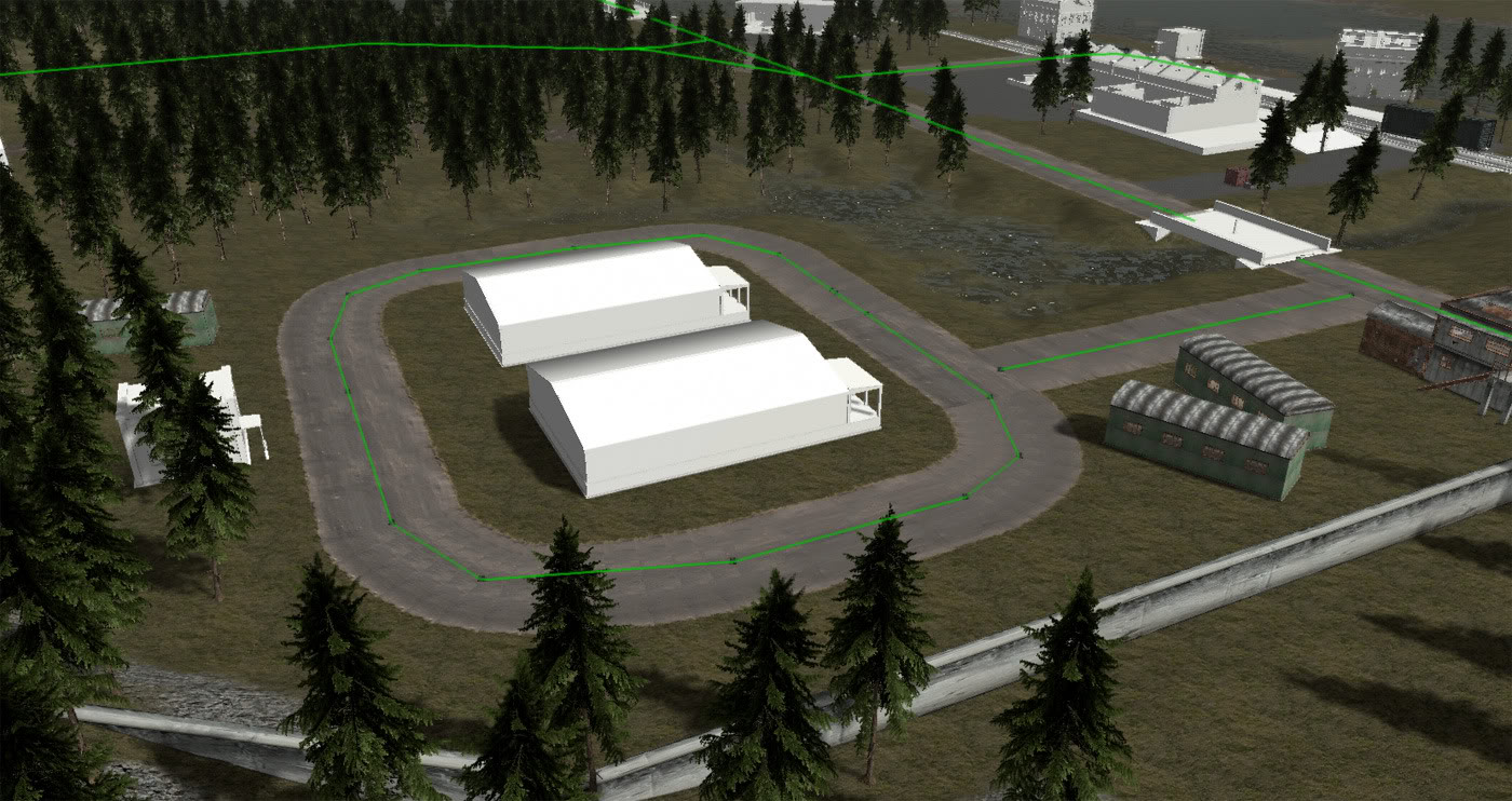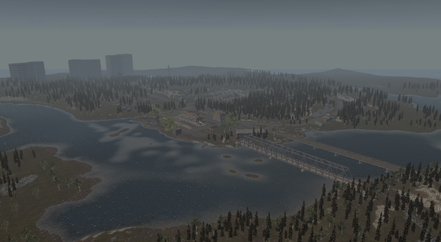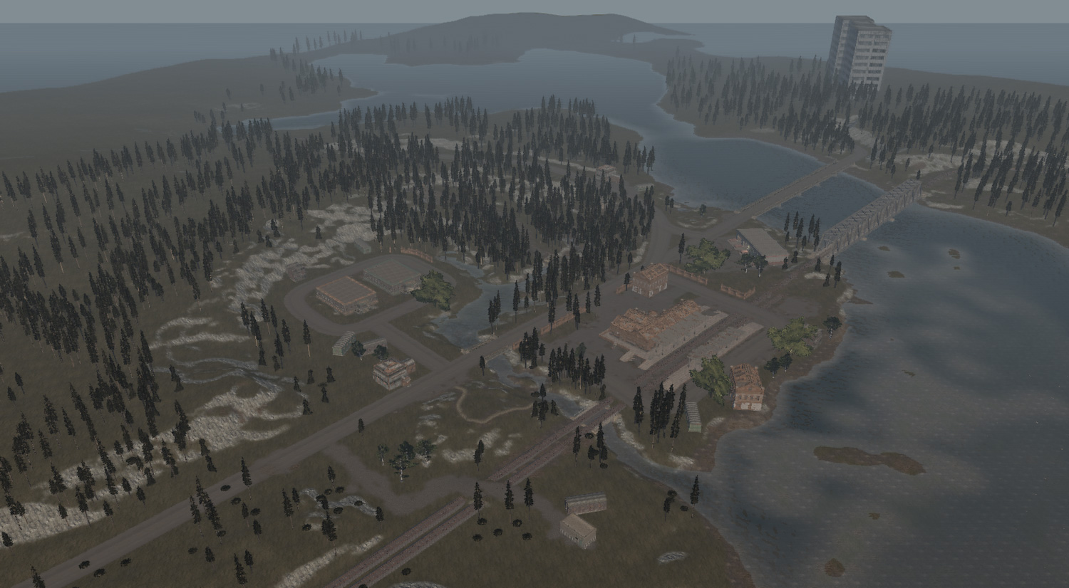 With most of the rail lines and roadways planned out, I continued to block out models like the highway bridge, the barracks, and the abandoned house. These were placed where the sketch called for them, and in most cases their placement did not change much by the end of the project. I began laying down large sections of pavement terrain textures for parking lots, and I used a pine tree placeholder model to plan out my forests and to test the billboard system in Leadwerks. Thanks to the automatically generated billboards I was able to use the vegetation tool to paint vast forests for the horizon. At this stage, the base for the swampy areas were placed, and the river shape was finalized.