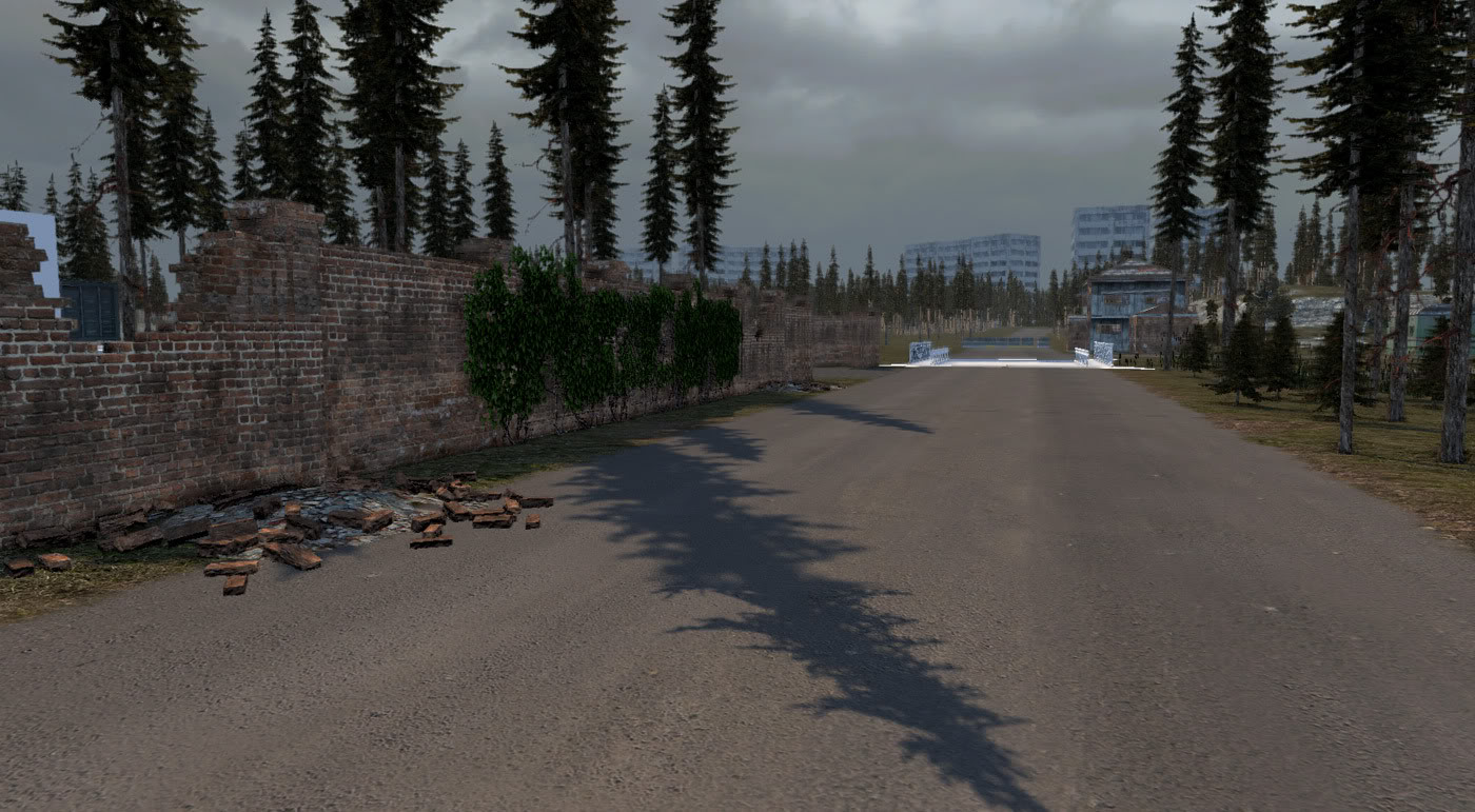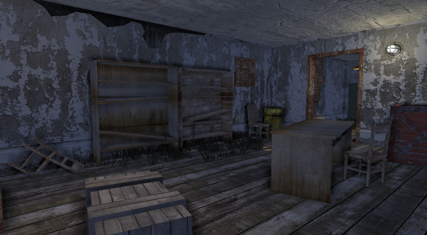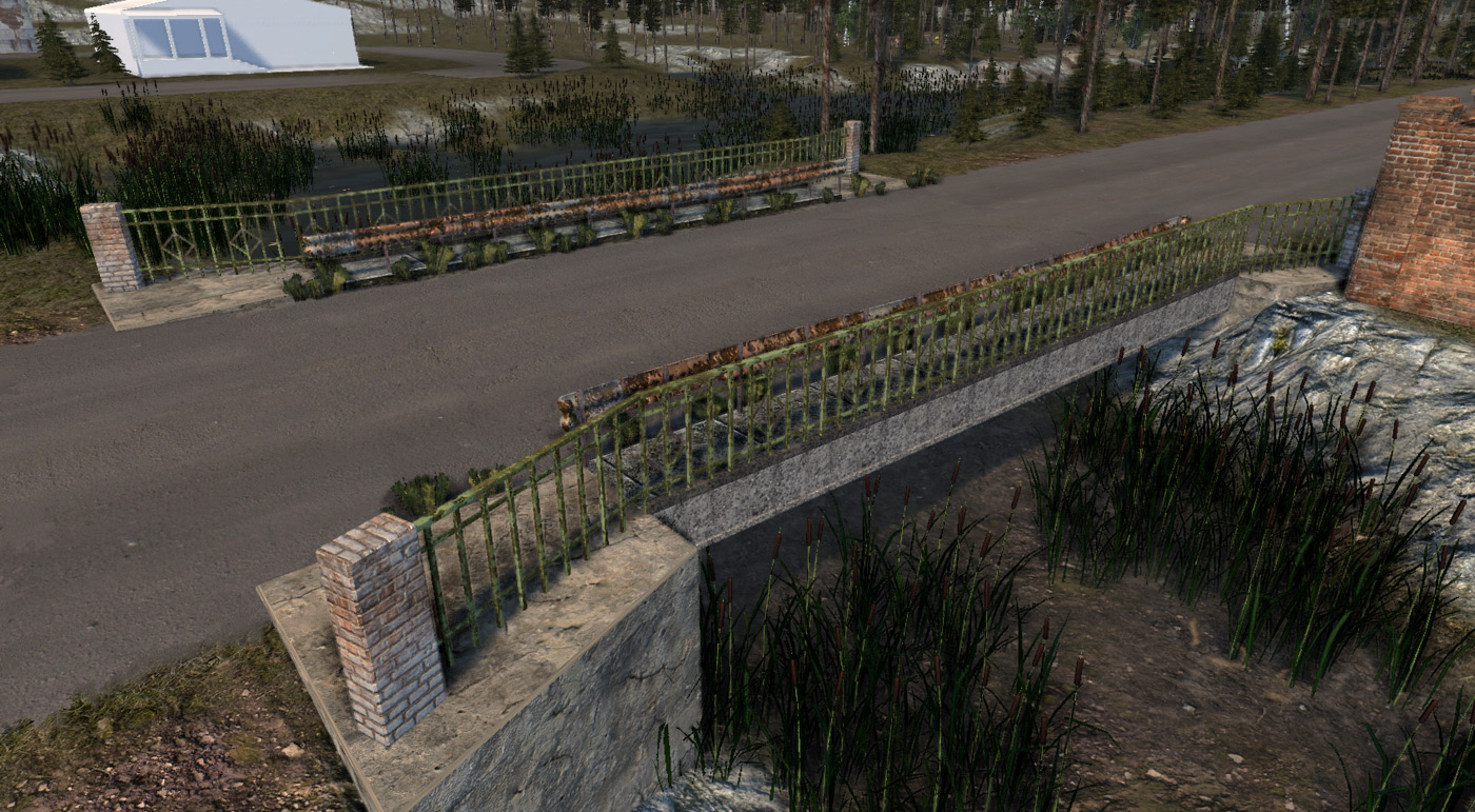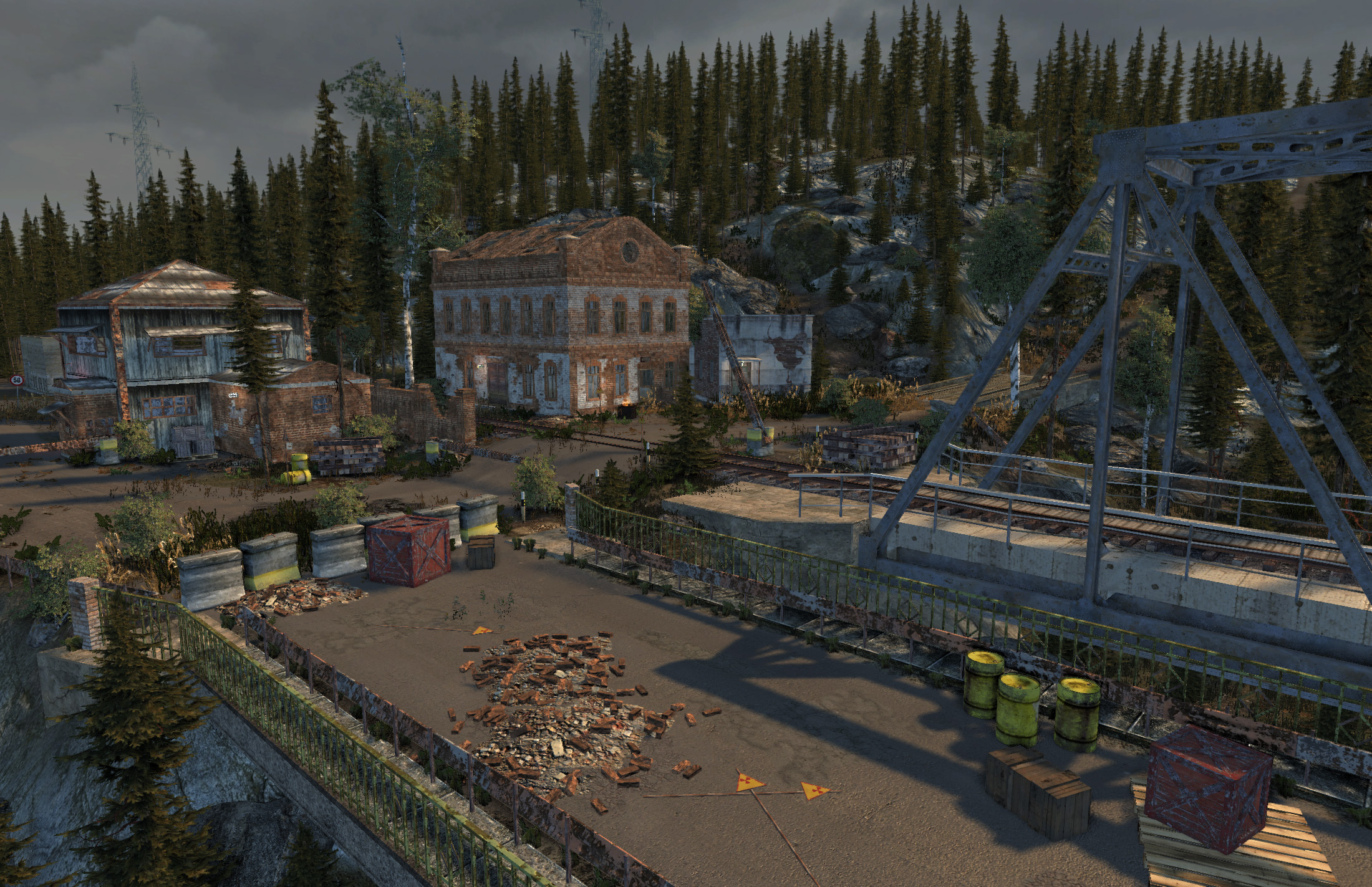 Vegetation and natural props were provided by fellow artist Michael Betke of Pure3D. Using Michael's excellent plants, trees, rocks and more (and with the help of the Leadwerks vegetation layering system) I was able to quickly and efficiently create very realistic looking forests and plant life across the environment. More small props were created to detail the scene like road barriers and wooden furniture, and I began work on more debris props, background prop buildings and decals. The road bridge was completed (based on the famed "Bridge of Death" near Chernobyl) and set up in a modular system like the railroad bridge. I finalized the Bober warehouse building and imported all of the textures into Leadwerks, along with another small "railroad outbuilding" structure with no interior. A demo scene was created using all of the models completed up to this point so we could take some beauty renders.