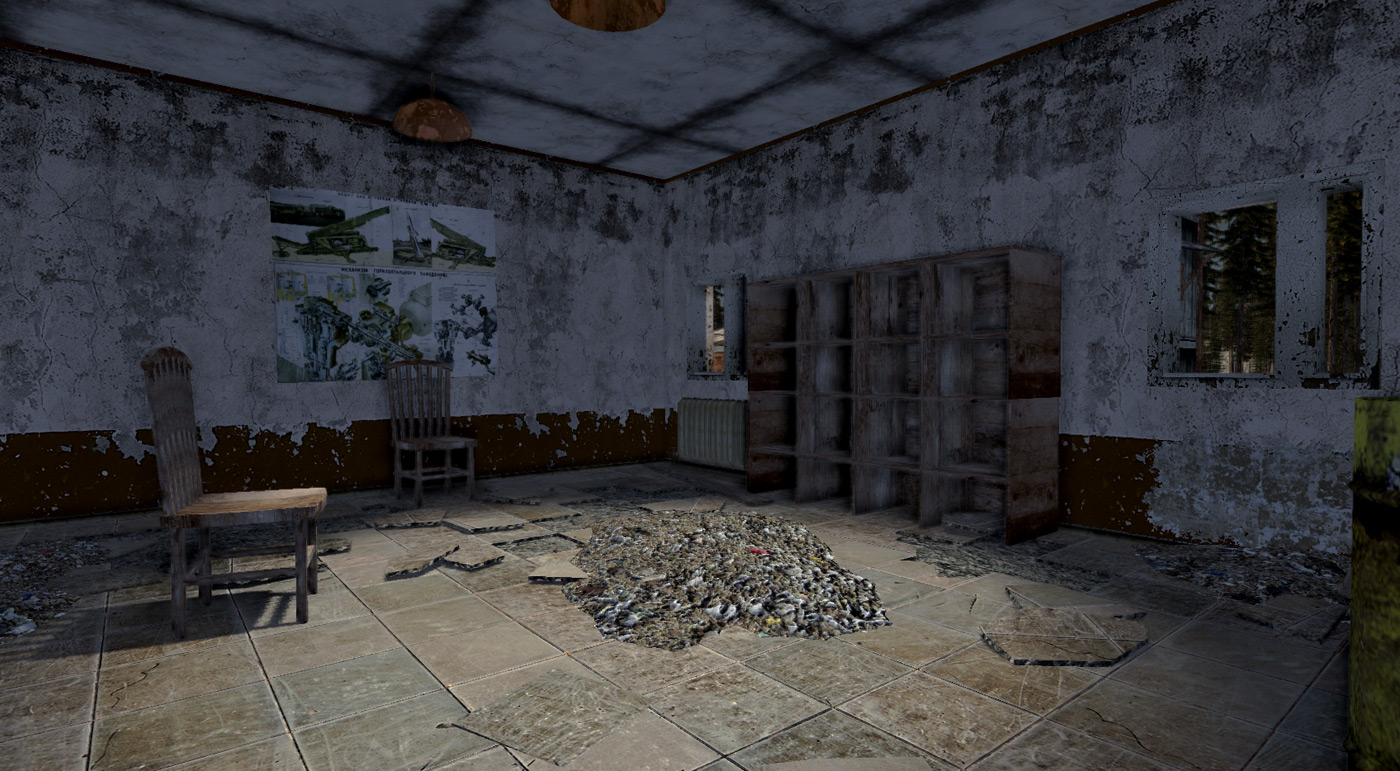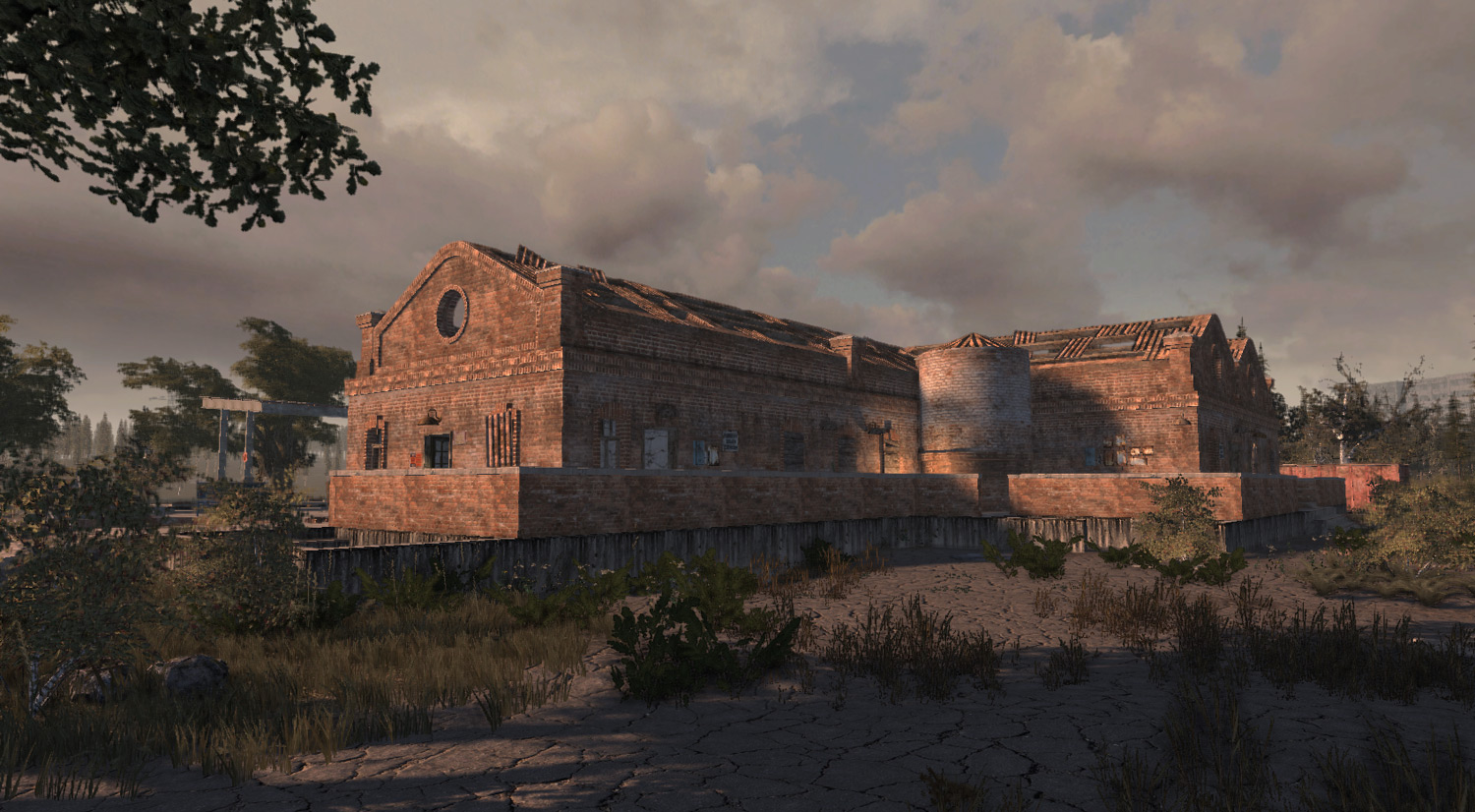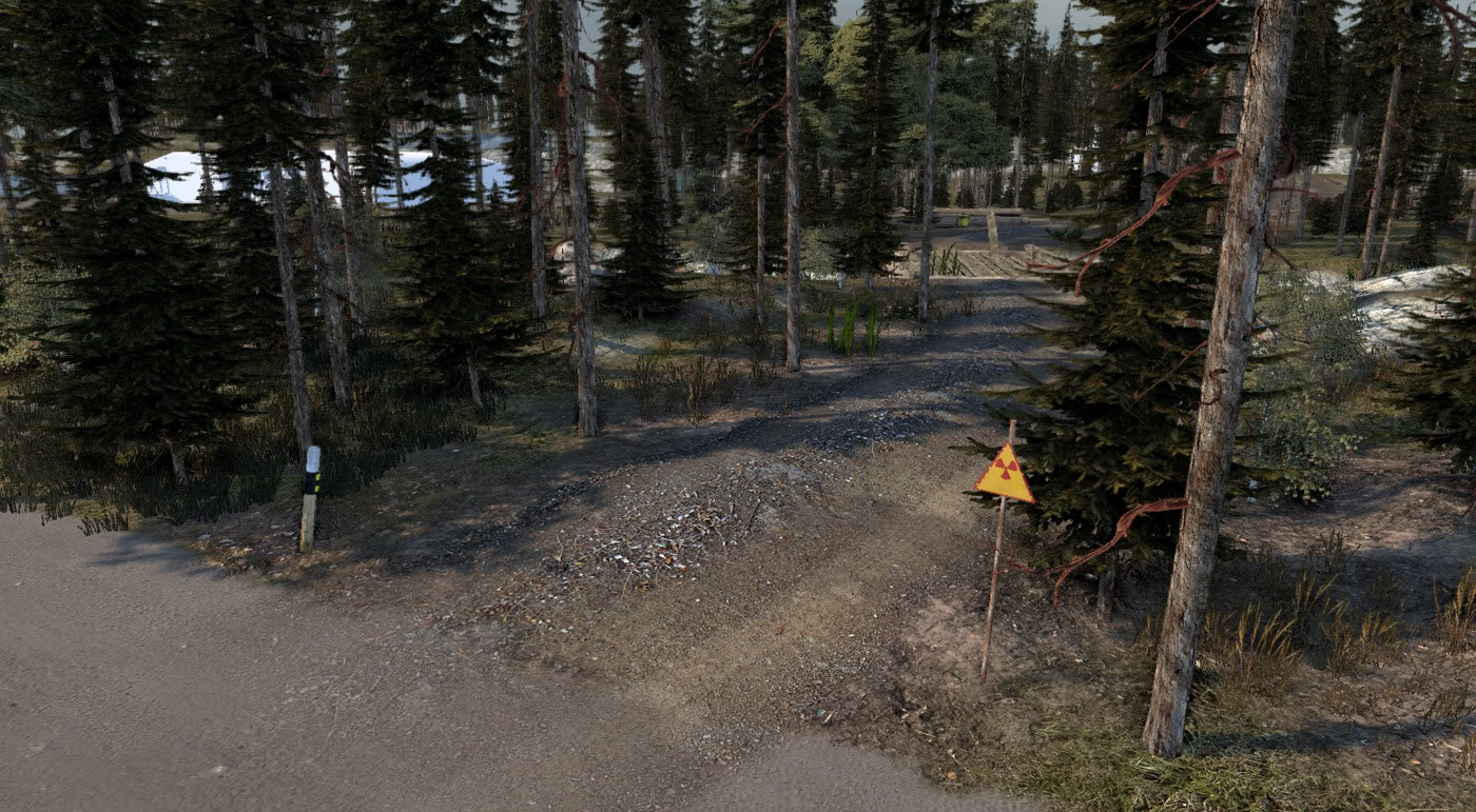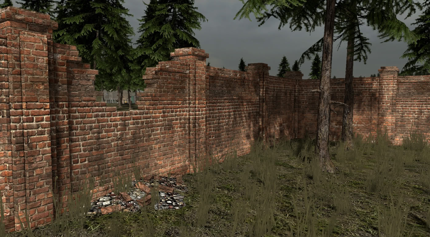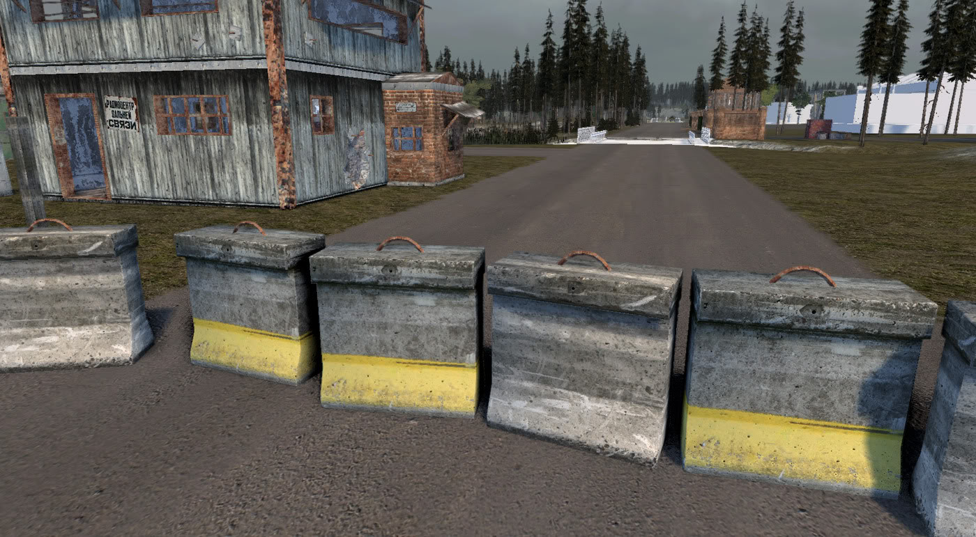 Vegetation and natural props were provided by fellow artist Michael Betke of Pure3D. Using Michael's excellent plants, trees, rocks and more (and with the help of the Leadwerks vegetation layering system) I was able to quickly and efficiently create very realistic looking forests and plant life across the environment. More small props were created to detail the scene like road barriers and wooden furniture, and I began work on more debris props, background prop buildings and decals. The road bridge was completed (based on the famed "Bridge of Death" near Chernobyl) and set up in a modular system like the railroad bridge. I finalized the Bober warehouse building and imported all of the textures into Leadwerks, along with another small "railroad outbuilding" structure with no interior. A demo scene was created using all of the models completed up to this point so we could take some beauty renders.