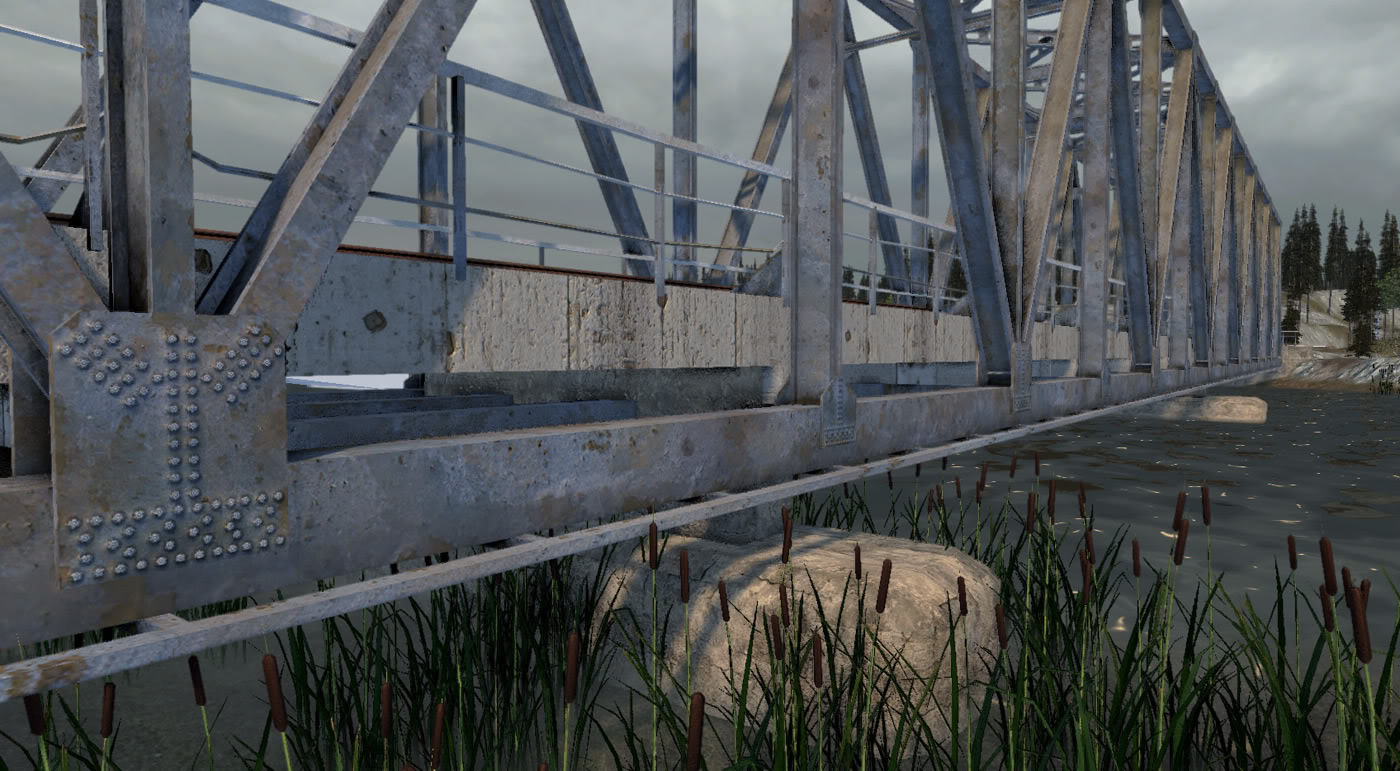 About two months into the project I continued placing basic vegetation and painting rock and dirt textures. I began experimenting with overcast lighting and fog using the sky box that I had created. Dirt road texture templates were created, and I began working on small areas of detail to experiment with micro-detail in the Leadwerks engine. I textured and finished the modular railroad bridge and placed it in the scene. The main playable area was not as high above the river surface as I had planned, so I created a small berm for the railroad bridge to rest on so that it would not be too close to the water.