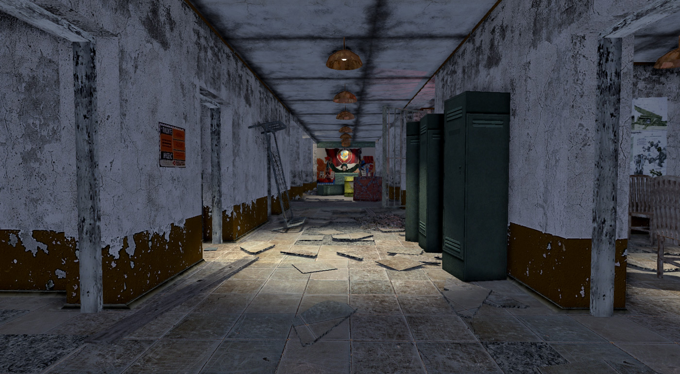 With nearly all of the asset modeling done, I turned my attention to the last few buildings and final lighting and detailing. Several different skyboxes and times of day were experimented with until I finally settled on a partially overcast sunset which allowed me to introduce a warm orange-yellow color to the lighting. Some light fixtures around the map had to be adjusted when the sun angle changed, but the new skybox brought an eerie feeling to the project along with a nice "painted" look. More vegetation layers were added which allowed me to layer grass, shrubs, leaves and add some large dead trees to the basic vegetation. During these last few weeks of the project I finished work on a larger number of additional debris and background props in addition to the "abandoned house" building. An underground lab was created at the back of the military base, and several detail passes were made to the entire map. After some optimization, the project was deemed complete.