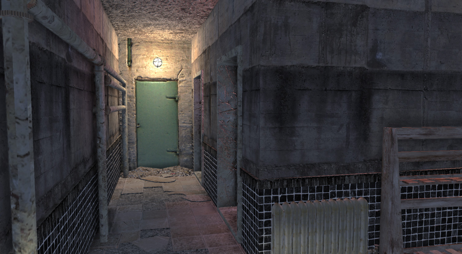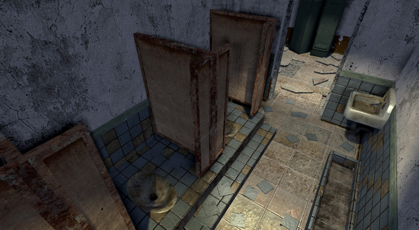 The next stage of the project required quite a lot of new art creation. I needed to create two military barracks buildings to be the focus of the military base area of the environment. I chose my reference (an actual barracks in a small outpost in the real Zone) and created two versions of the barracks. Besides creating a large amount of new artwork for these buildings (include trash and debris, military cots, bathrooms, sinks and other props), these buildings were the first objects that I used vertex colors on. The vertex colors were used to blend a brick texture with green stucco, adding a lot of interest to the main structure of the building without resorting to decals. This also allowed me to faithfully recreate the style of the barracks that I was taking inspiration from.