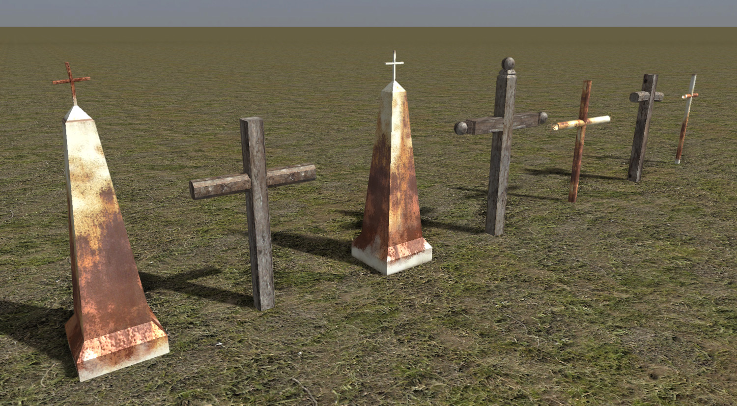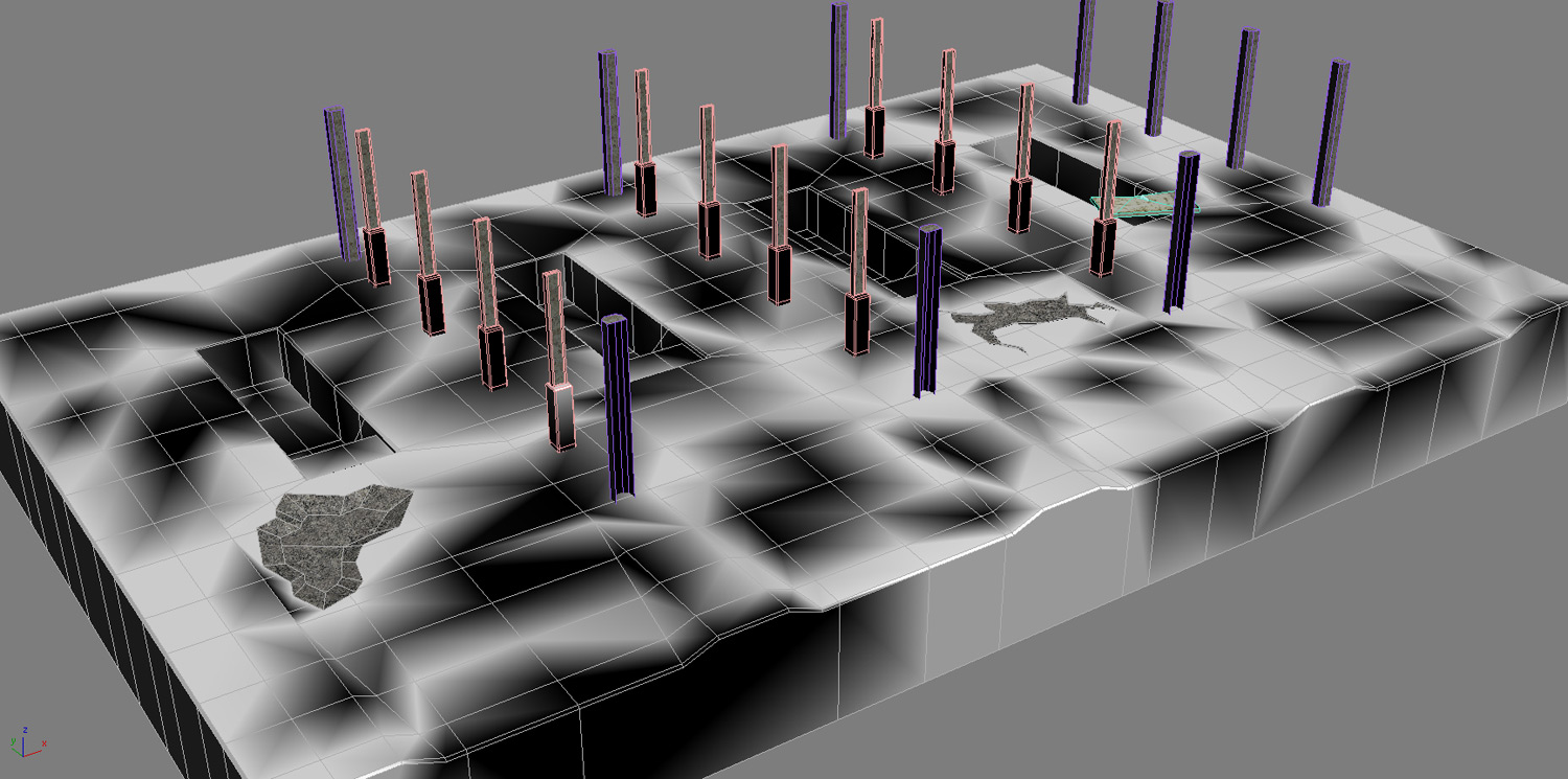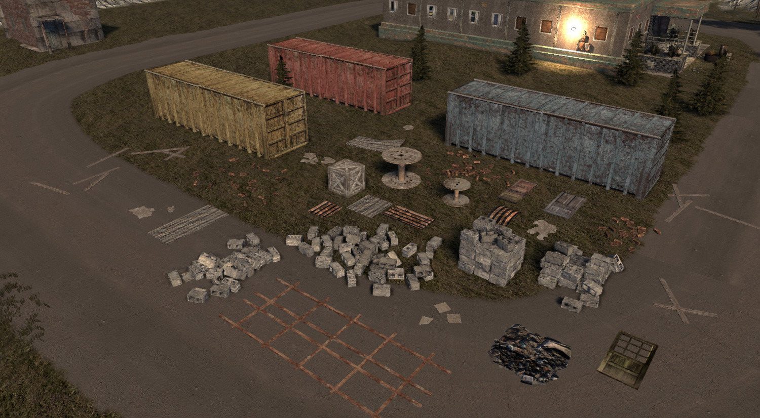 I also used vertex colors to blend two kinds of concrete textures for the base of the derelict garage, one normal concrete and one stained with oil. These two textures shared a single normal map, which saved texture memory. A large number of debris props were created at this stage to help populate the scene. These range from piles of cinder blocks to large shipping containers to scattered wood and bricks.